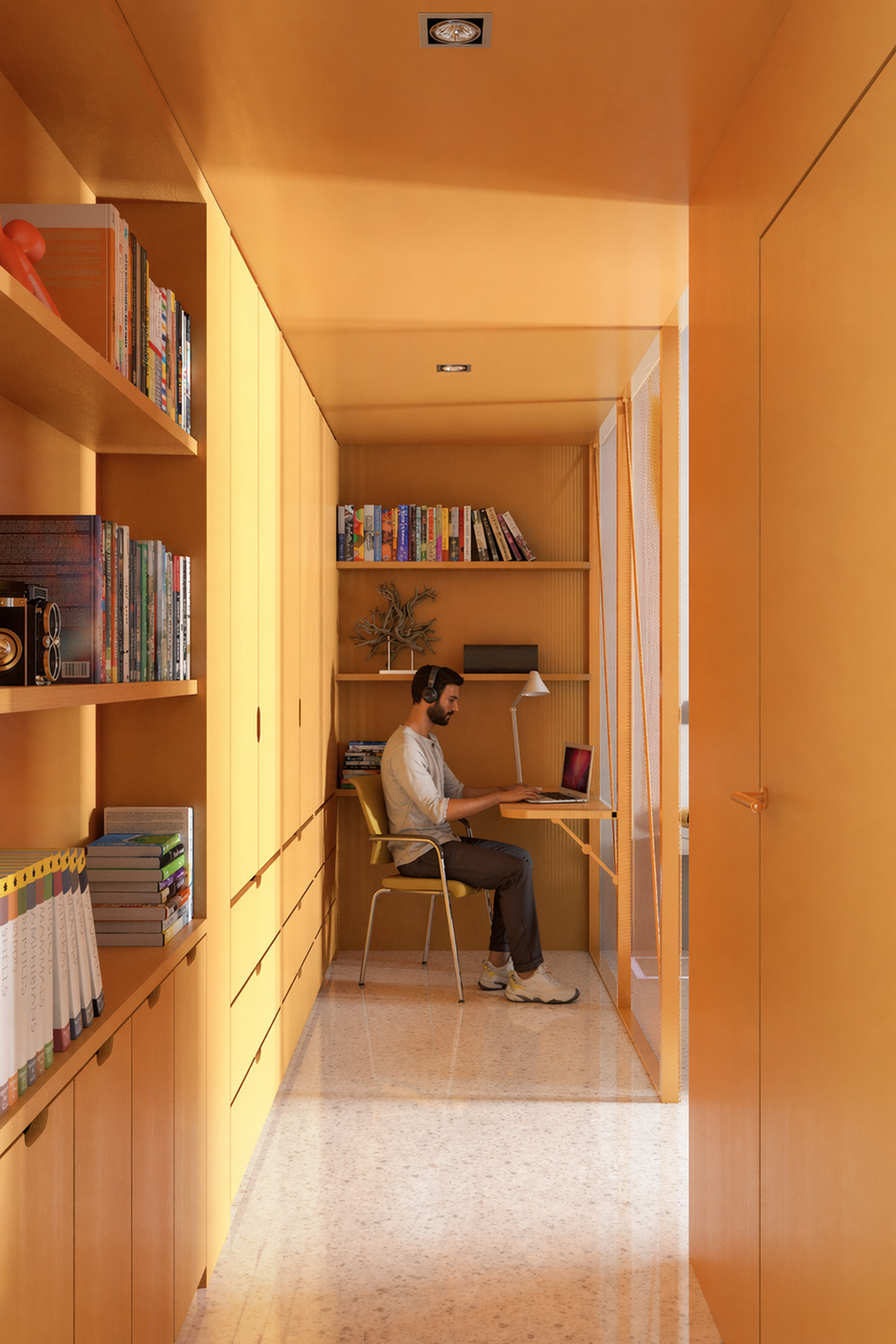 ENG The project involves the renovation of a small apartment through the introduction of a distinctive monochromatic element that adapts to the various rooms and allows for a multifunctional use of the spaces.