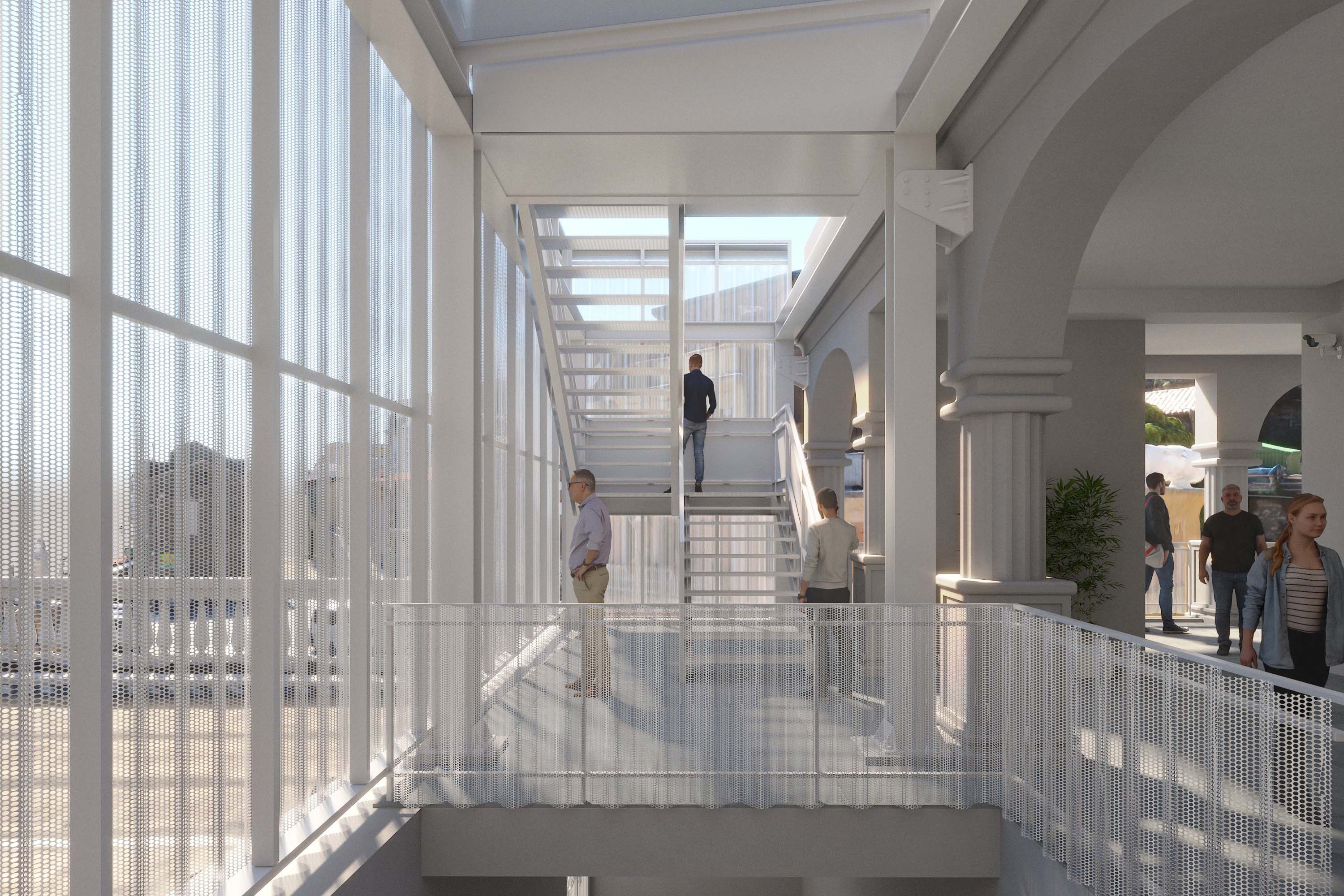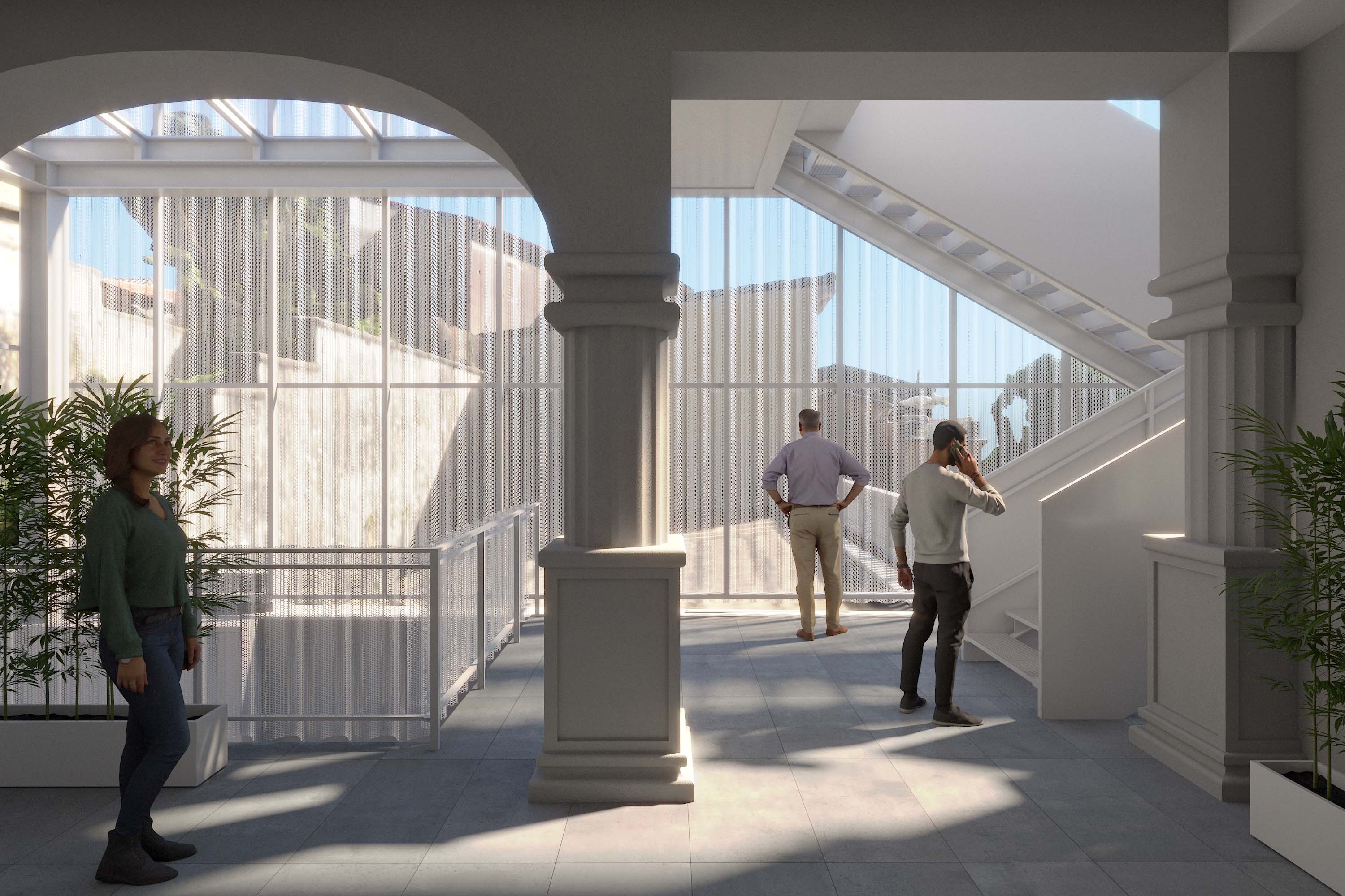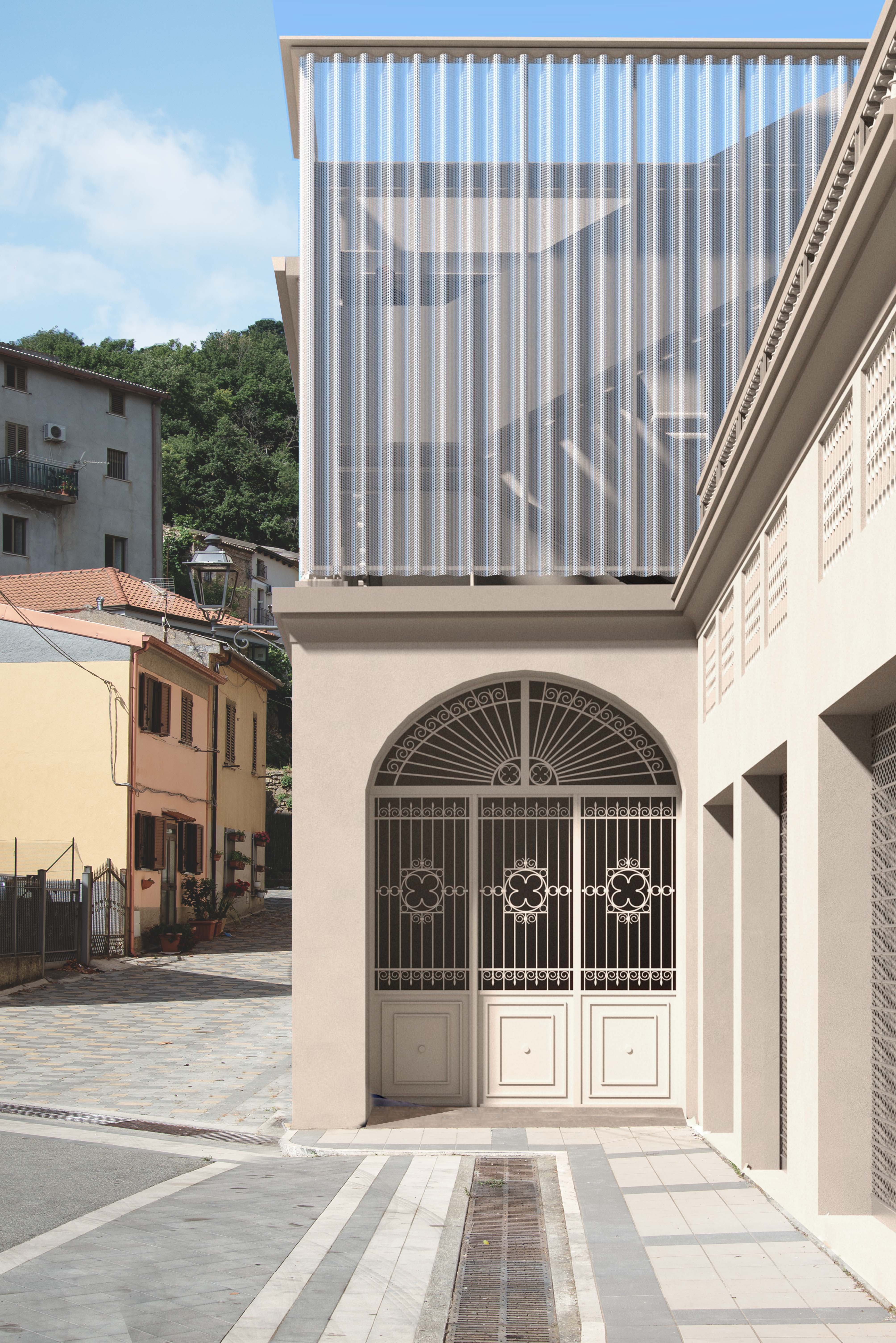 ENG The redevelopment project of Palazzo Caligiuri is based on the insertion of a lightweight contemporary system both inside and outside a historic structure, creating a balanced dialogue between memory and innovation: the façade is redefined through a filtering metallic “second skin” that controls light and privacy without concealing the original building, while the interiors are reorganized through lightweight steel structures, walkways, and staircases that enhance the existing architectural elements; the result is a permeable, luminous, and dynamic space in which the new stands out for its transparency and reversibility, helping to reactivate the identity of the building without altering its historic character.