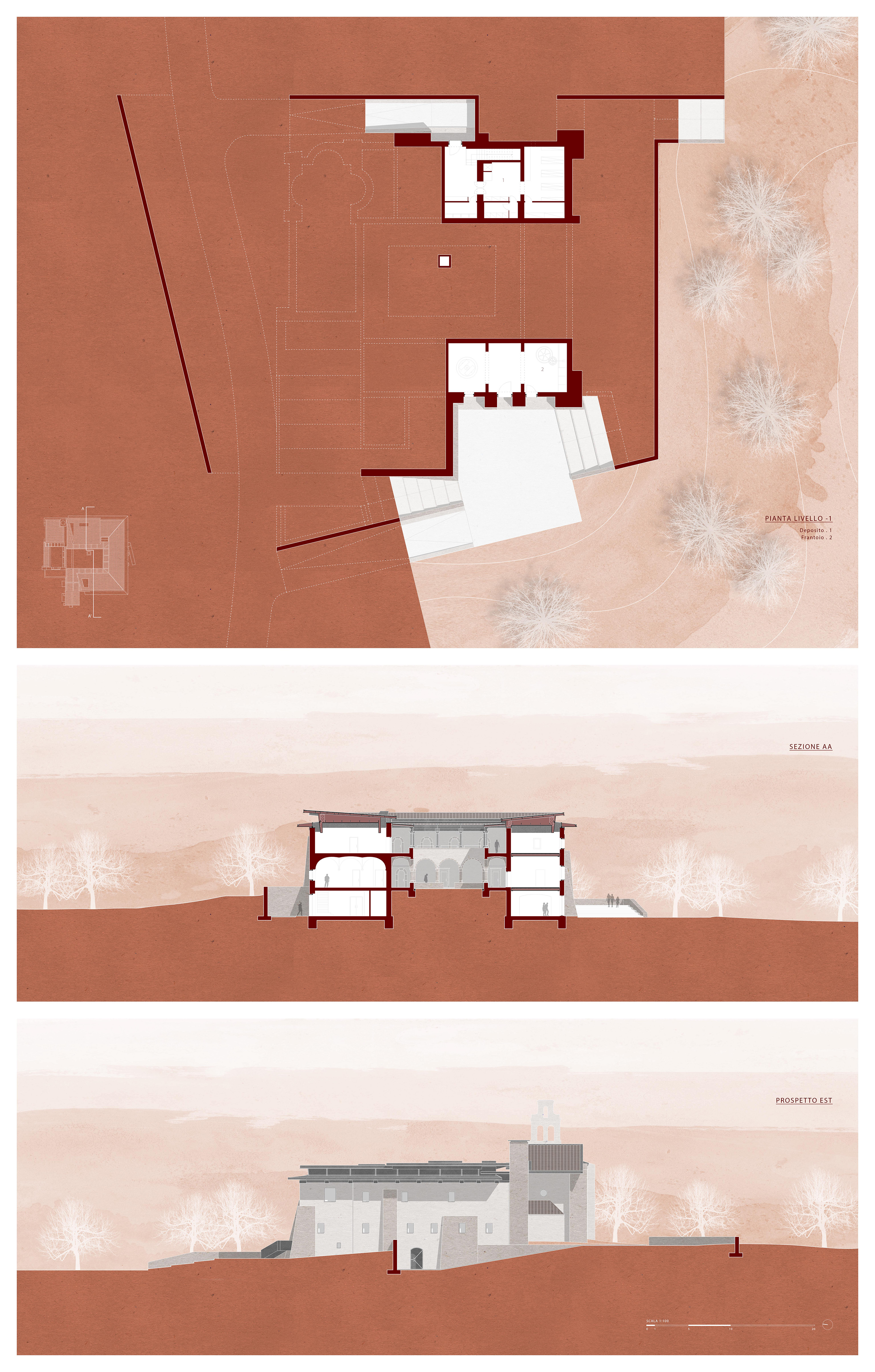 The new identity of the Ex Convent relates directly to the territory and the important food and wine tradition. C.E.E.S. it thus becomes a center of excellence for the study, enhancement and promotion of local products by providing the public and researchers with a multifunctional and all-encompassing space capable of creating a new centrality in the Lazio hills area. The goal is to develop a food and wine center of excellence with kitchens, laboratories, libraries, thematic and multifunctional classrooms and a restaurant. The entire area on which the convent is located is redesigned and revalued with both an architectural and naturalistic intervention.
