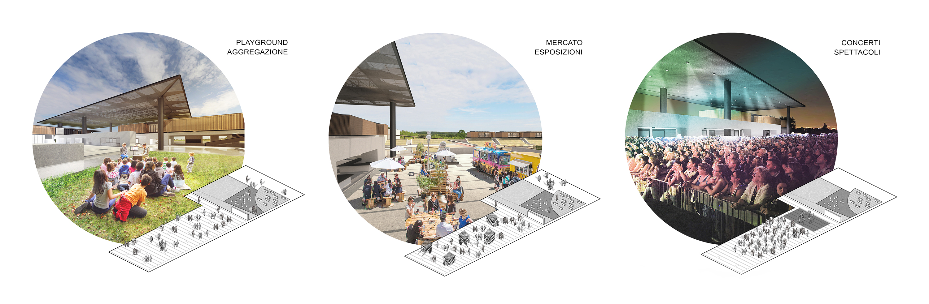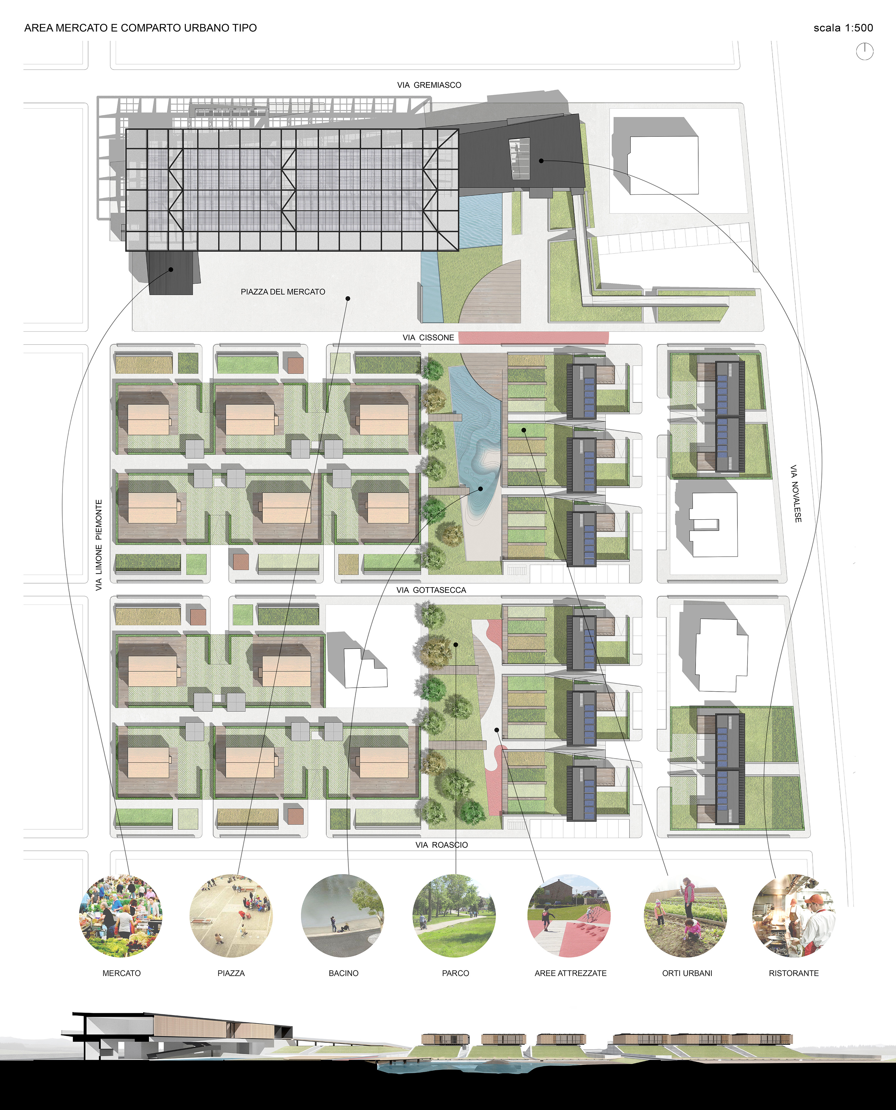 ENG CENTRO is a regeneration and redesign project of the agricultural toponym of Tragliatella near Rome. The project develops with a first phase of analysis of the urban fabric and an investigation in the field to find the real conditions of the buildings and services present. The preparatory analyzes for the design also concern the social fabric and a preliminary investigation into the needs of the toponym. The project redesigns a new guideline for territorial development through the definition of macro strategies focused on sustainability and the relationship with the agricultural vocation of the toponym. The urban design takes up the existing one and integrates essential elements to guarantee adequate distances and spaces for interaction in order to develop an urban fabric that breaks down the distance between public and private. The mobility currently entrusted to large dirt roads with no services is designed following the main vehicular routes on which a branched pedestrian and cycle road system with ample parking spaces is grafted. The fulcrum of the town planning project and the identity of the toponym is the Central Market: a large public square that can be used in a multipurpose manner throughout the day, dominated by a single roof that houses volumes for offices and commercial activities. From the market, towards the inside of the town, an urban park extends generated by the movement of the earth necessary for the development of the town, subsequently reunited in a variegated naturalistic system composed of urban gardens, ponds, pedestrian paths and areas game, which in addition to the social function contributes to the bioclimatic well-being of the toponym. The residential units designed differ in type and size in order to make scalability and flexibility possible to accommodate a varied social community.