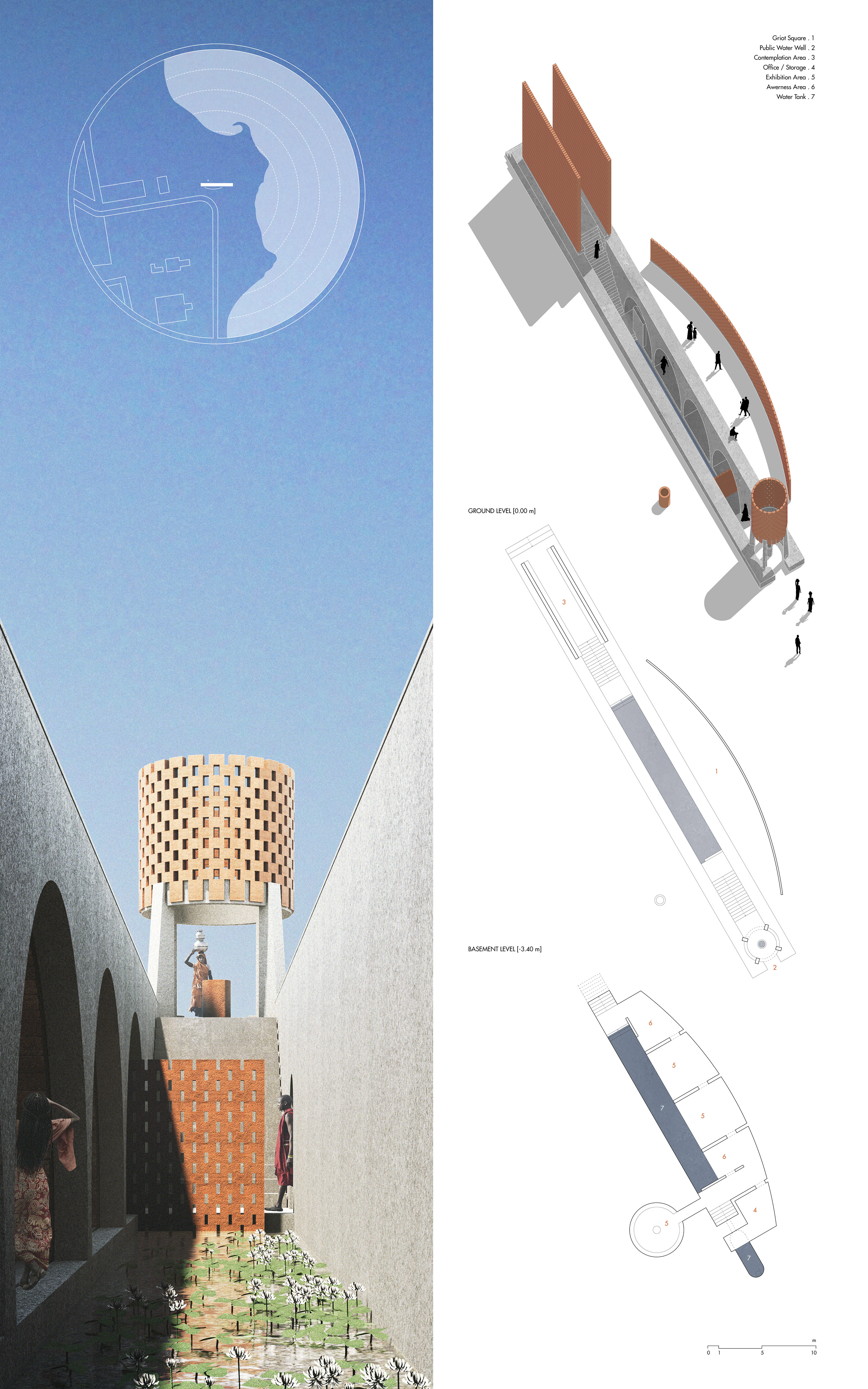 ENG The "Peace Pavilion" for the city of Sedhiou aims to be a reference point to raise awareness among local and international communities, a space in which to promote peace, a contemplative and multifunctional structure, able to provide the community with an identity through values of memory and solidarity. The pavilion is represented as a long cut in the ground, to remember the scars that wars have left on the face of the African region. Around this cut are placed structures with elementary geometries built with local materials and techniques, each of which identifies a function: an area to hand down the tradition orally from the Griot, a public well for the community and an area of contemplation. On the lower floor we find the rooms dedicated to art exhibitions and to spread awareness on the theme of war. The structure marks a path through the various rooms and then culminates in the contemplative area, rediscovering the surrounding landscape through a guided view. The contemplation area, formed by two high walls in alternating laterite blocks, focuses its vision on a glimpse of the Casamance river and isolates the entire surrounding context. Winds from the southwest are filtered through the openings in the walls and amplify the sensory perception. In addition to exploiting the thermal mass of the earth, the climate system uses convective ventilation. The pavilion uses a rainwater collection and reuse system through a water tank and a natural filtering system (phytodepuration) connected to a Venetian well for public use.