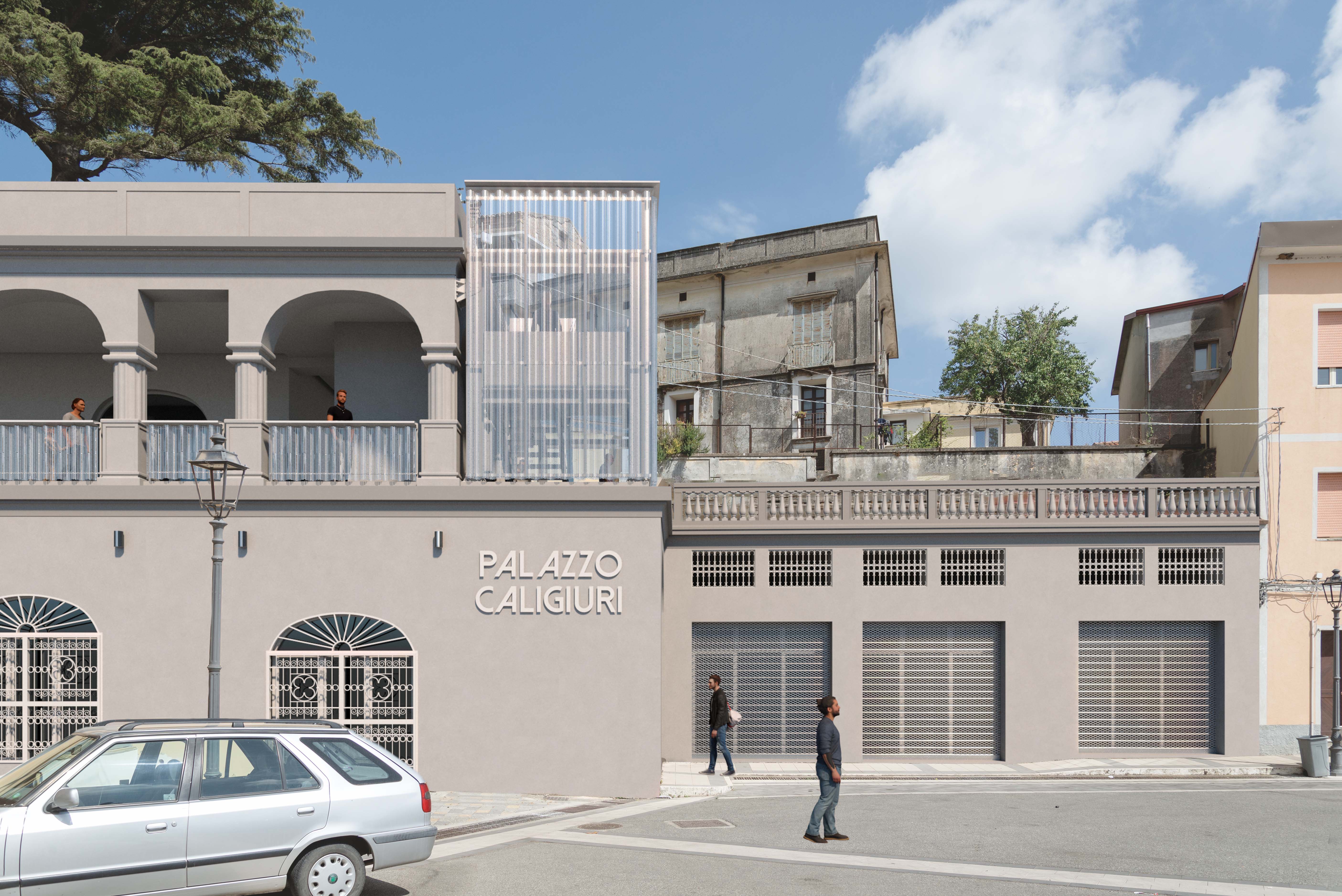 ITA Il progetto di riqualificazione di Palazzo Caligiuri si basa sull’inserimento di un sistema contemporaneo leggero all’interno e all’esterno di un organismo storico, costruendo un dialogo equilibrato tra memoria e innovazione: la facciata viene ridefinita tramite una “seconda pelle” metallica filtrante che controlla luce e privacy senza nascondere l’edificio originario, mentre gli interni sono riorganizzati attraverso strutture leggere in acciaio, passerelle e scale che valorizzano gli elementi architettonici esistenti; ne deriva uno spazio permeabile, luminoso e dinamico, in cui il nuovo si distingue per trasparenza e reversibilità, contribuendo a riattivare l’identità del palazzo senza alterarne il carattere storico.