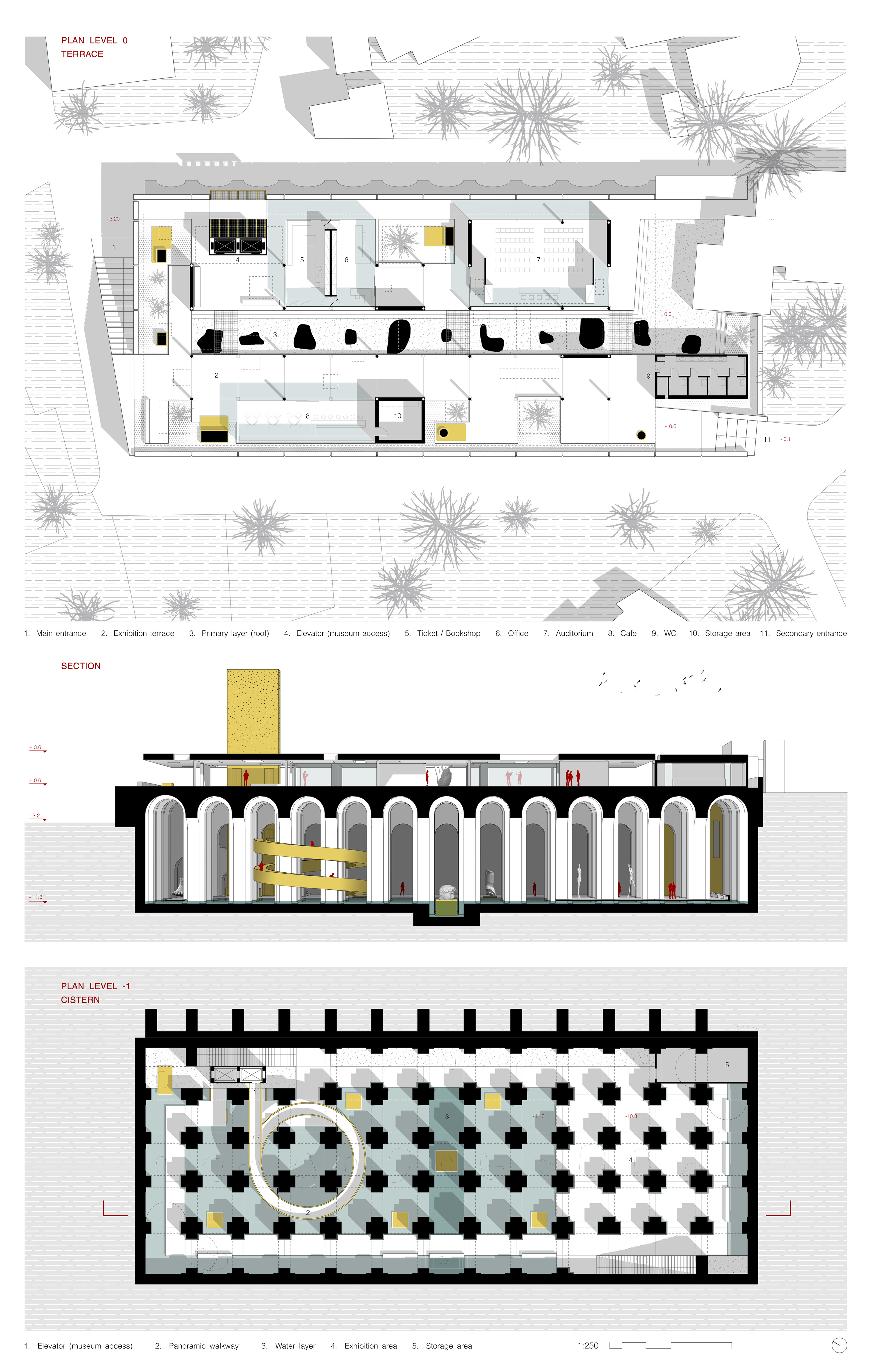 ITA Il progetto vuole creare uno spazio museale che valorizzi sia la Piscina Mirabilis (il contenitore) che l'arte contemporanea (il contenuto) attraverso una serie di interventi che tengano conto del programma del concorso e delle caratteristiche della rovina romana, suddivisi in due aree principali, terrazza e cisterna. La nuova copertura, elemento caratterizzante del progetto, identifica l’intervento e si inserisce all'interno del contesto circostante fornendo un nuovo sguardo sull'orizzonte. Il disegno di quest’ultima richiama la conformazione della vecchia copertura, utilizzando lo stesso sistema di diffusione luminosa della cisterna. La nuova conformazione della terrazza panoramica attiva un processo di stratificazione, instaurando un dialogo con il "primary layer" della Piscina Mirabilis, accentuandone la forza evocativa delle aperture sulla vecchia copertura e facendone percepire lo spazio sotterraneo. Oltre ad accogliere le funzioni richieste dal programma, la terrazza diventa uno spazio pubblico aperto e accogliente in grado di stimolare culturalmente i cittadini. La cisterna diventa il museo stesso attraverso un percorso espositivo che ospita una collezione permanente e spazi per esposizioni temporanee. È un contrasto di ombra, luce, rovine e design, tutto amplificato e specchiato nell'acqua. La connessione tra terrazza e cisterna viene identificata attraverso un innesto dorato, creando un ponte fisico e metaforico tra le strutture e il museo contemporanei e antichi.